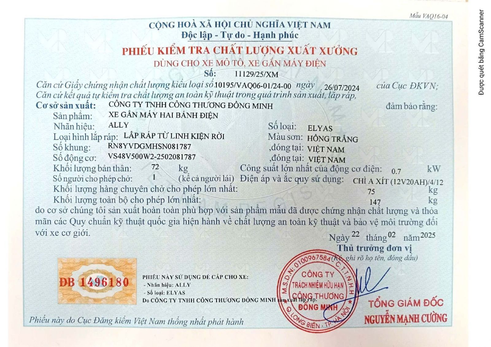 Xe đạp điện Ally Elyas có đầy đủ giấy tờ đăng kiểm và hoá đơn