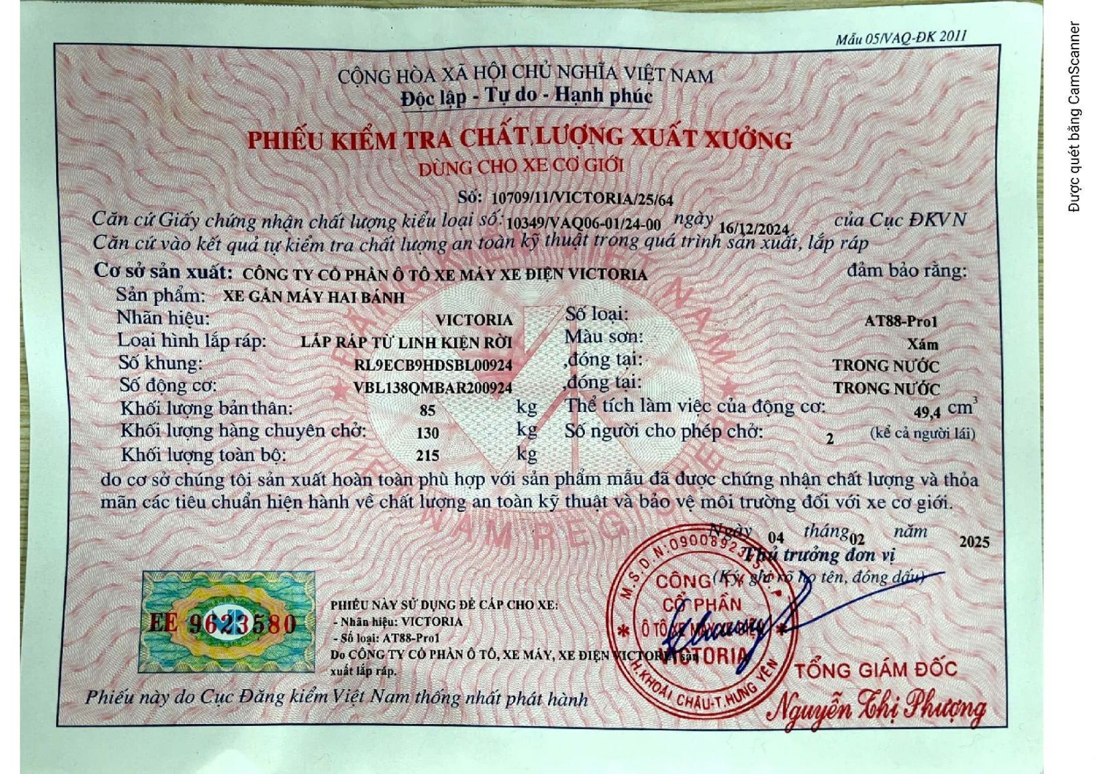 Xe ga 50cc Victoria AT88 Pro có đầy đủ giấy tờ đăng kiểm và hóa đơn.
