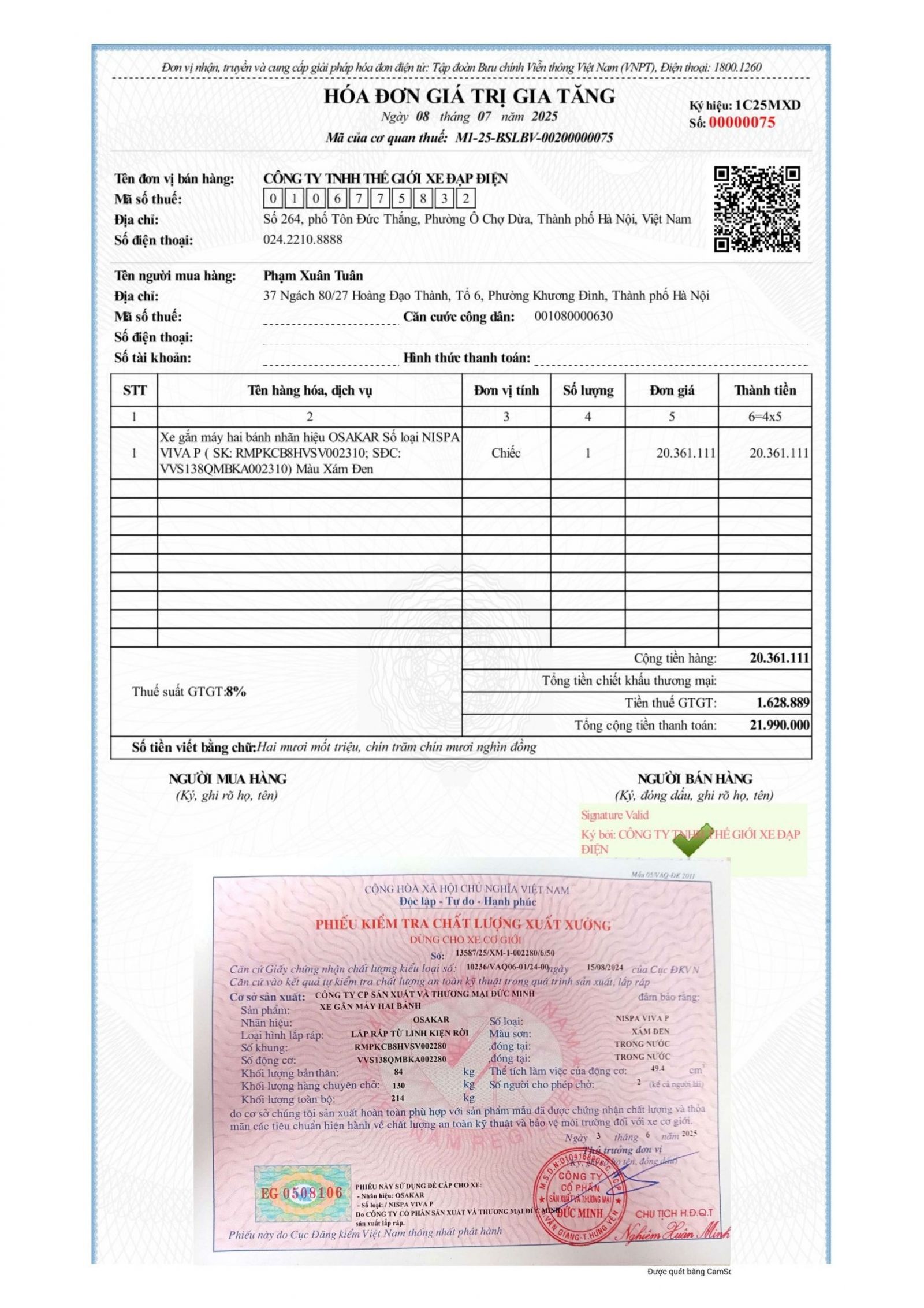 Xe ga 50cc Osakar Nispa Viva P có đầy đủ giấy tờ đăng kiểm và hóa đơn.
