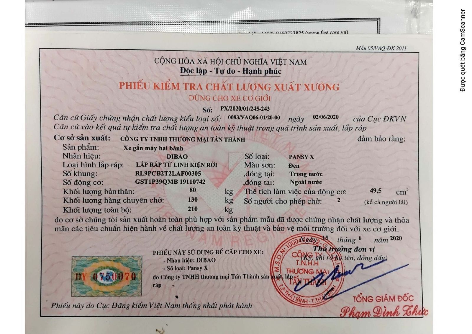 Xe Ga 50cc Dibao Pansy X có đầy đủ giấy tờ đăng kiểm và hóa đơn