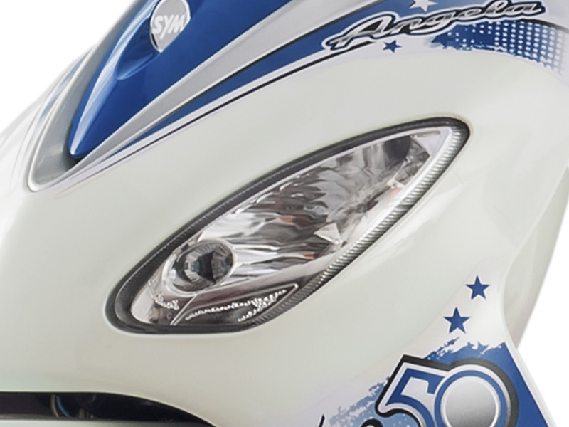 Mẫu xe máy SYM Angela 50cc sơn mờ với thiết kế nhẹ nhàng, mềm mại kết hợp với đường nét cá tính, pha chút cổ điển. Xe ấn tượng với đèn pha bo tròn, cụm đèn xi nhan trước tách biệt khi được đặt ở dưới mặt nạ.