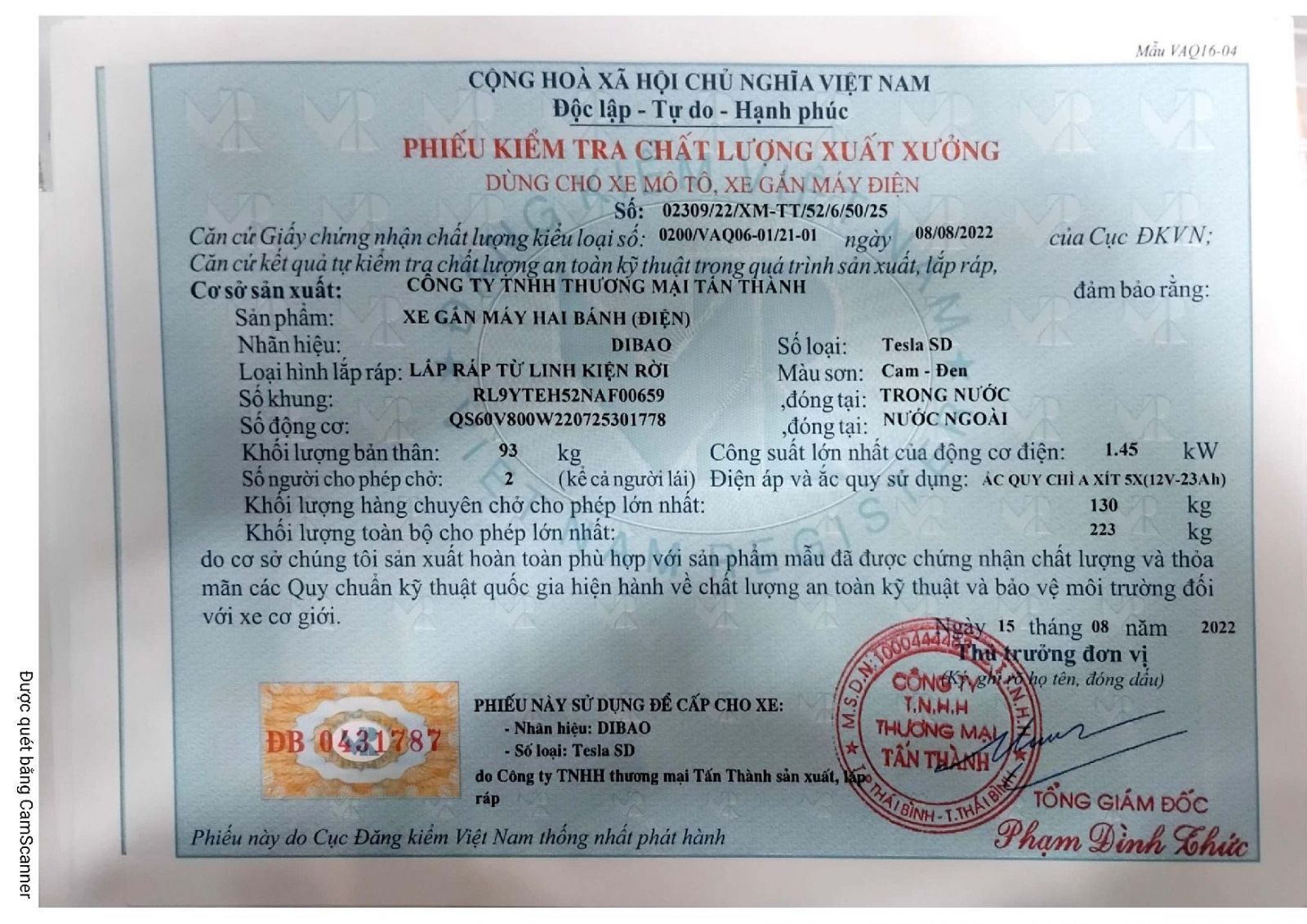 Xe máy điện Dibao Pansy Tesla SD có đầy đủ giấy tờ đăng kiểm và hóa đơn