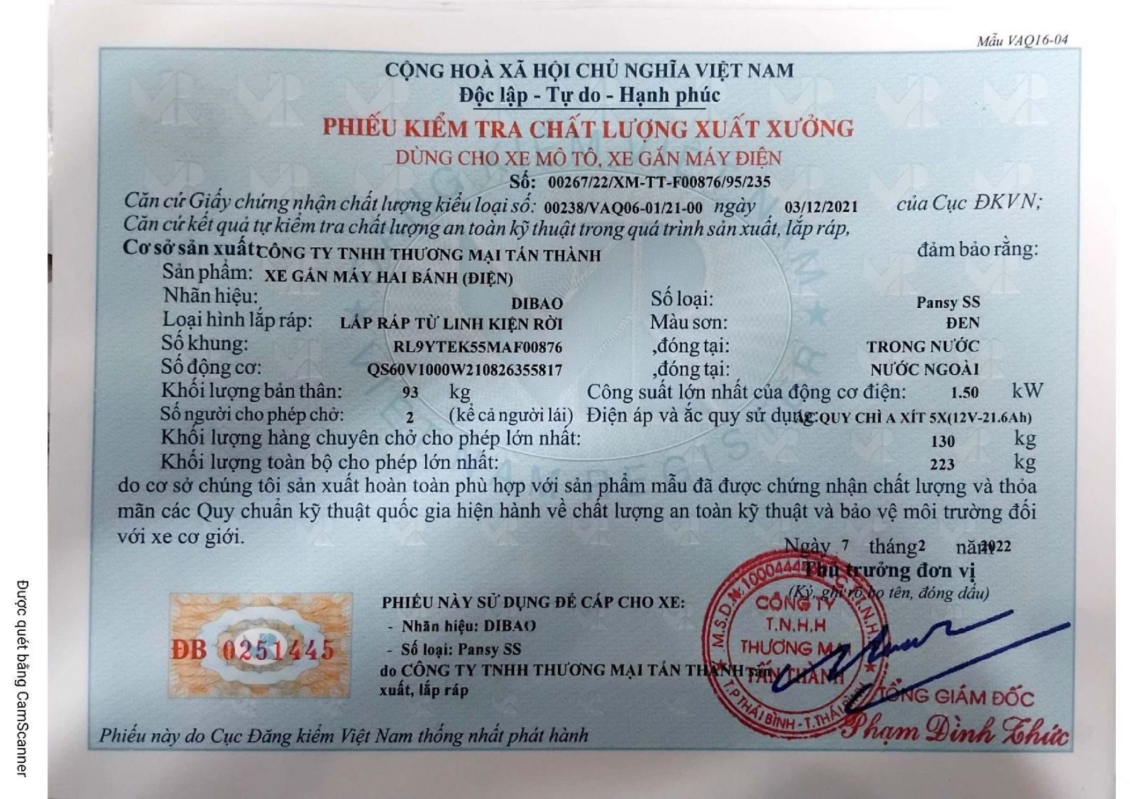 Xe Máy Điện Pansy S2 Dibao có đầy đủ giấy tờ đăng kiểm và hóa đơn
