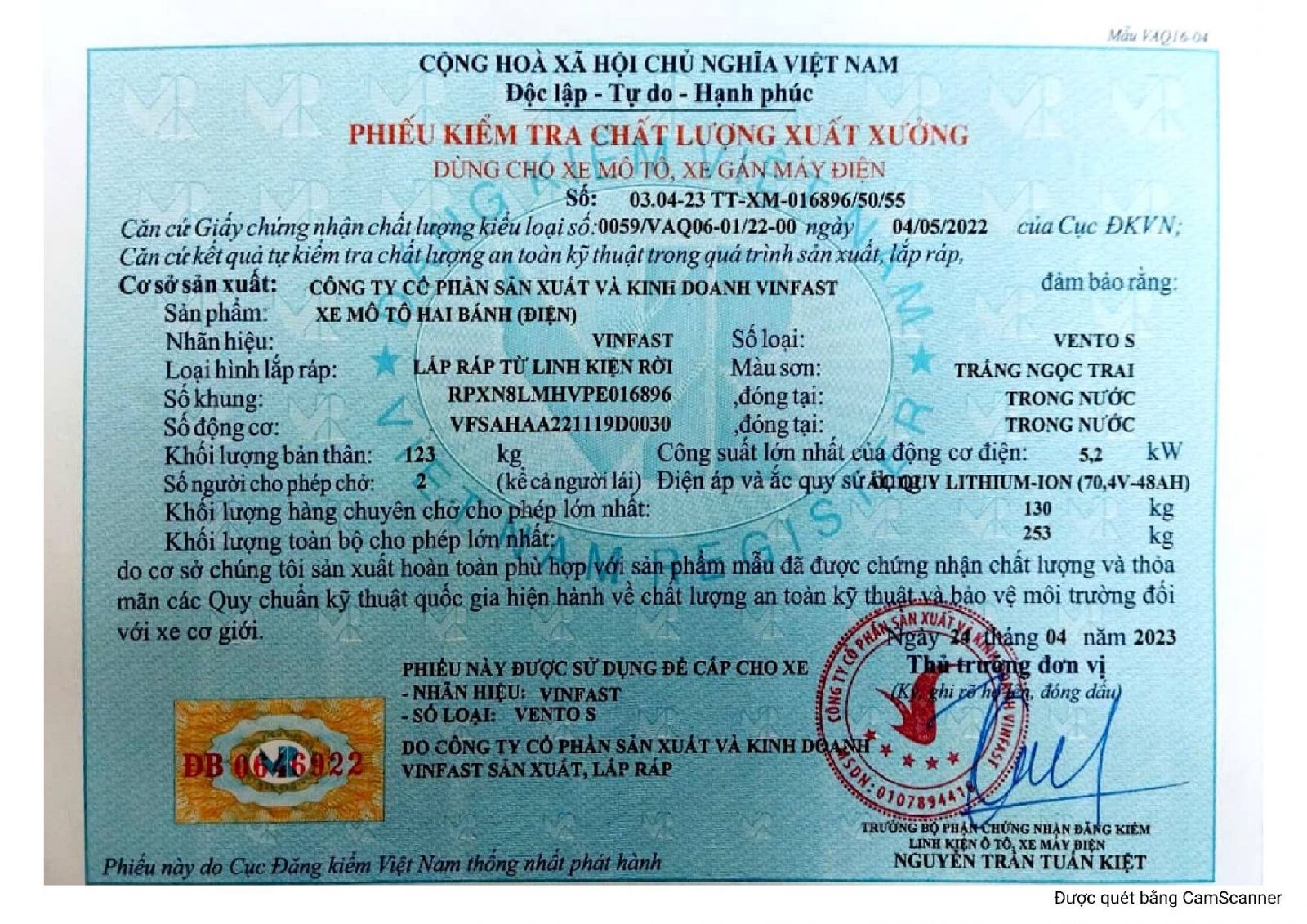 Xe máy điện VinFast Vento S có đầy đủ giấy tờ đăng kiểm và hóa đơn