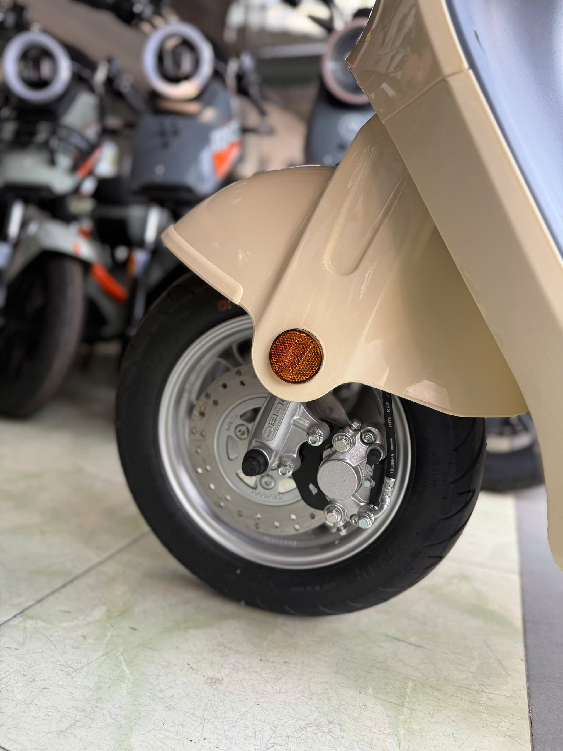 Phanh đĩa trước của xe là một trong những trang bị giúp giảm tốc nhanh chóng, hiệu quả và an toàn hơn. Hệ thống phanh này có khả năng kiểm soát tốt, hạn chế nguy cơ trượt bánh hoặc mất thăng bằng khi phanh gấp hoặc chạy ở tốc độ cao. Lốp Kenda không săm 300-10 cũng là điểm nổi bật, giúp xe duy trì độ bám đường tốt, hạn chế trơn trượt khi di chuyển trên mặt đường ướt hoặc trơn trượt.