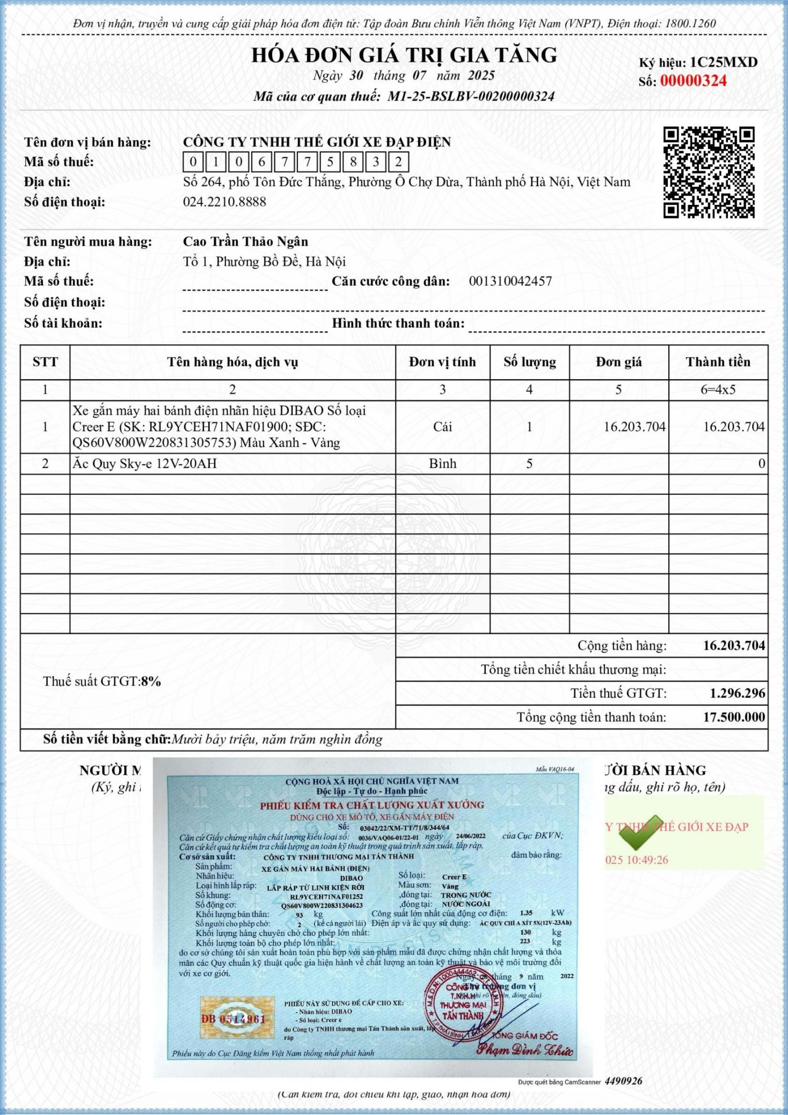Xe Máy Điện Dibao Creer E có đầy đủ giấy tờ đăng kiểm và hóa đơn.